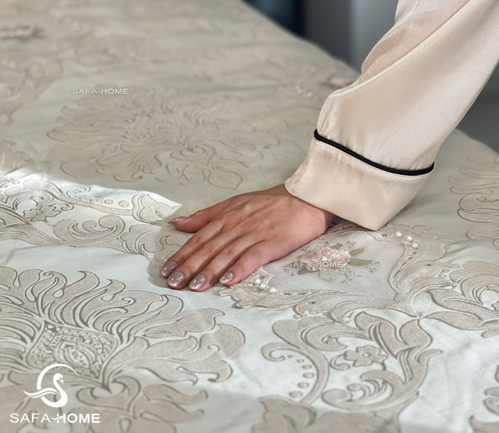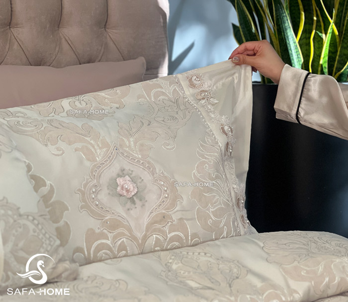 با انتخاب روتختی النا 9 تکه در رنگ نسکافهای همراه با مرواریددوزی و گیپور کار شده، اتاق خوابی متفاوت و شیک میسازید. این محصول علاوه بر کیفیت بالا، فضایی رویایی و چشمگیر به دکوراسیون شما میدهد.