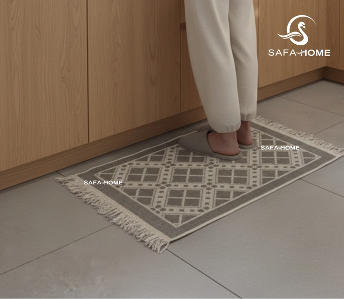 پادری طرح گلیم سفید طوسی، با ابعاد استاندارد 45×75 (2±) سانتیمتر، مناسب برای قرارگیری در بخشهای مختلف خانه مانند جلوی سرویس بهداشتی، کنار سینک یا ورودی اتاقهاست. بافت نخپنبهای این پادری باعث جذب سریع رطوبت شده و آن را به انتخابی مناسب برای محیطهای مرطوب تبدیل میکند.