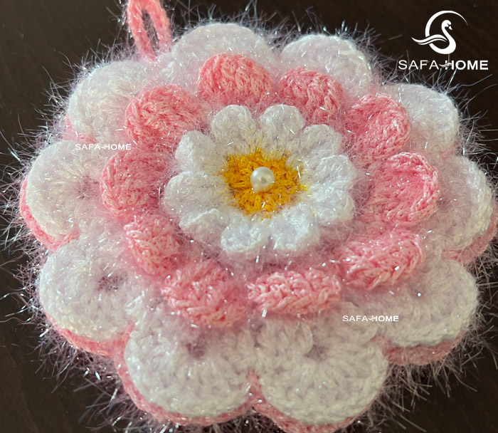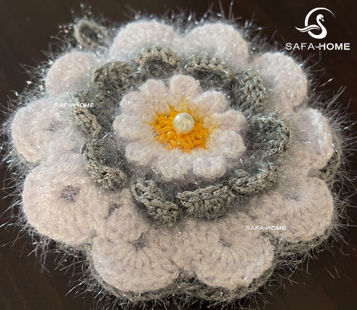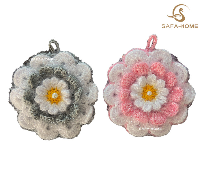 یک اسکاچ آشپزخانه کاربردی میتواند در عین سادگی، جلوهای زیبا به فضای سینک بدهد. اسکاچ آشپزخانه دستباف گل رویایی با رنگبندی طوسی و صورتی، انتخابی فانتزی برای استفاده روزمره است.