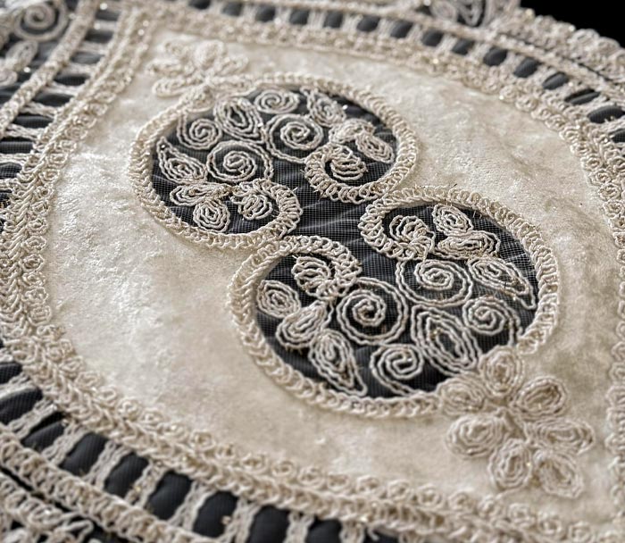 تزئینات قیطاندوزی با دقت بالا اجرا شدهاند و باعث شدهاند لبهها کاملاً منظم، ظریف و ماندگار باشند. دوخت تمیز و دقیق، کیفیت نهایی محصول را تضمین کرده و باعث شده است در استفاده روزمره نیز فرم و زیبایی خود را حفظ کند.