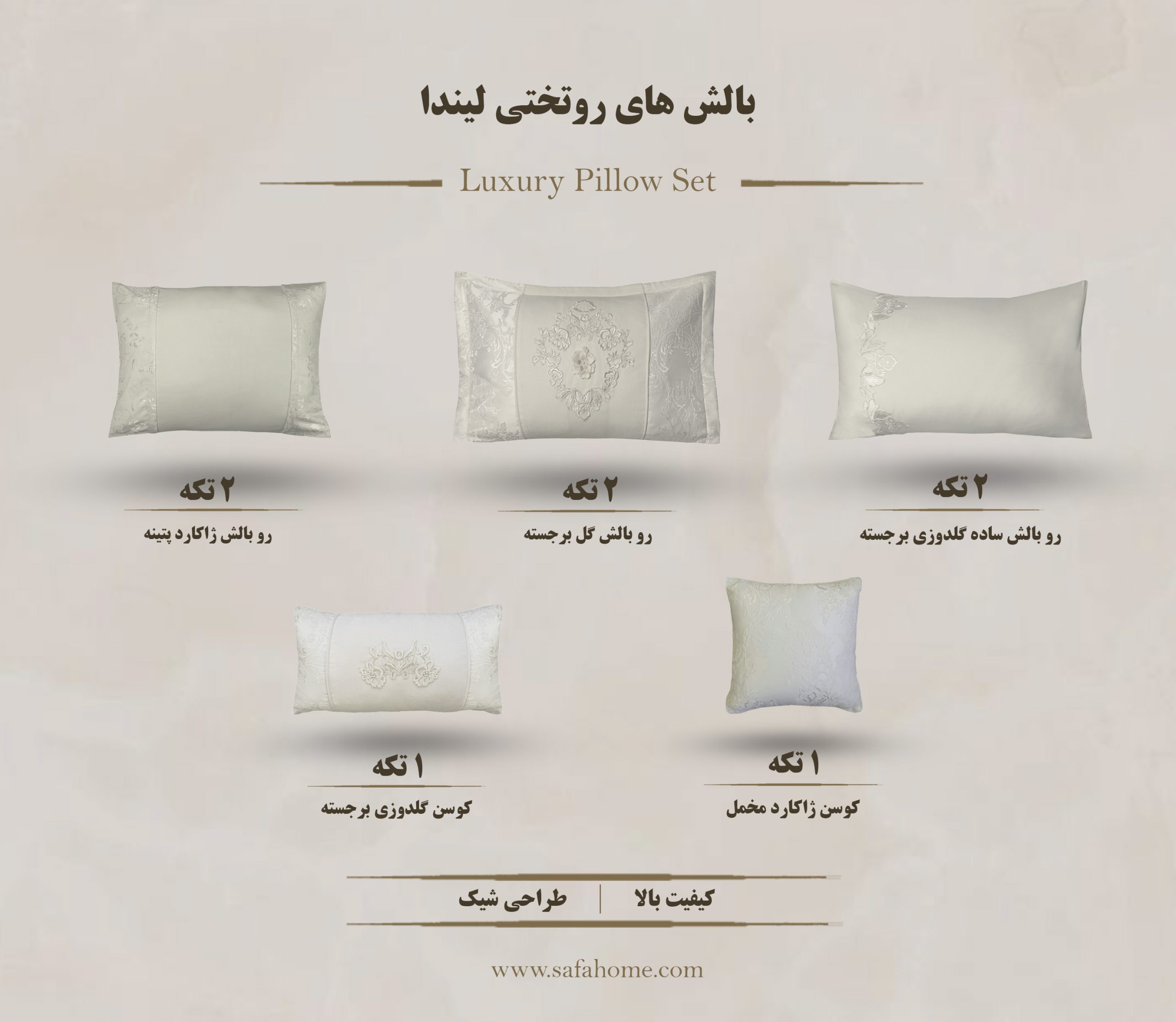 برند صفاهوم با استانداردهای حرفهای تولید، تضمینکننده کیفیت و اصالت محصول است. روتختی لیندا مناسب تمام زوجهای جوانی است که میخواهند جهیزیهای شیک، لوکس و باکیفیت داشته باشند.