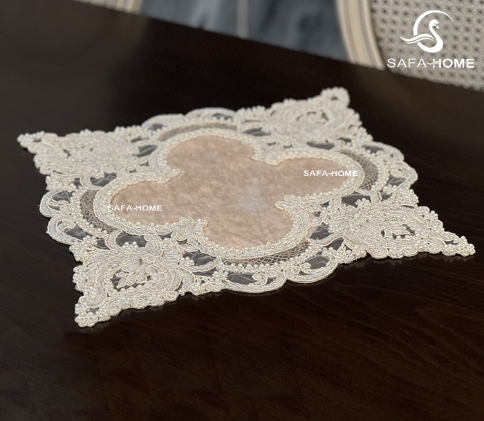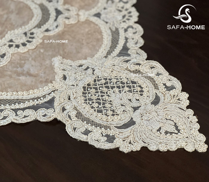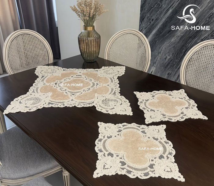 رومیزی لوکس مربع گل، انتخابی ظریف و شیک برای افرادی است که به دکوراسیون کلاسیک و خاص علاقه دارند. این ست ۳ تکه رومیزی جلو مبلی مربع با ترکیبی از تور و مخمل نسکافهای روشن، جلوهای چشمنواز به فضای پذیرایی شما میبخشد. تزیینات ظریف منجوق و مروارید روی پارچه، زیبایی کار را چند برابر کرده و حس لوکس بودن را به محیط القا میکند.