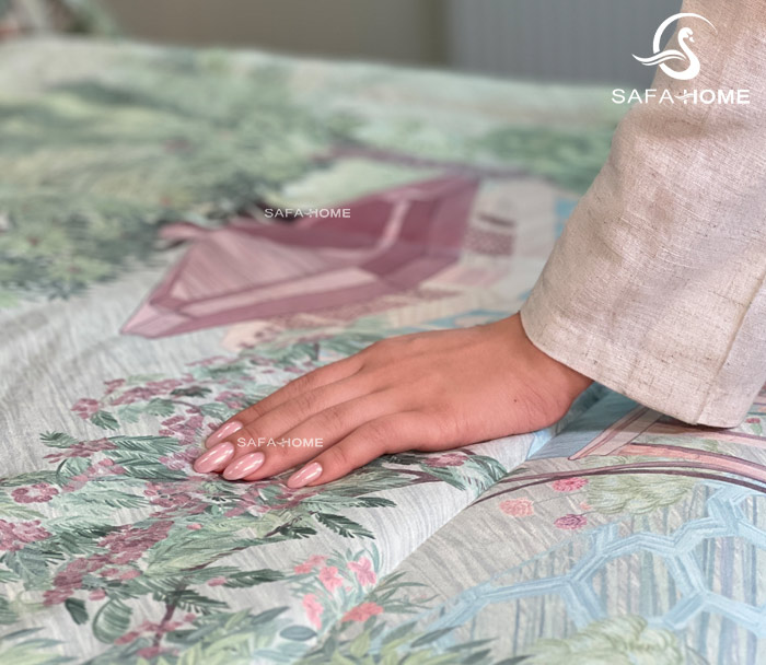 رویه این روتختی از شانل ابریشم اصل تولید شده که نرمی و لطافت خاصی به همراه دارد. زیره آن نیز از کتان ارگانیک باکیفیت است که به هیچ عنوان پرز نمیگیرد و دون نمیشود.
