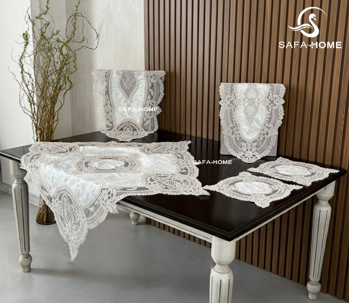 ست رومیزی مخمل قیطان طرح لوتوس، یک مجموعه ۵ تکه کامل و کاربردی است که برای انواع میزهای پذیرایی، جلو‌مبلی و عسلی طراحی شده.