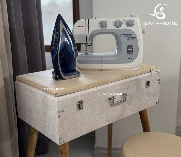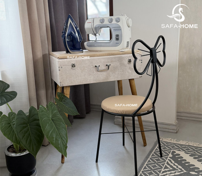 این میز با طراحی مدرن و رنگ نسکافهای پتینه، علاوه بر ایجاد نظم در فضای خانه، محیطی مناسب برای دوختودوز و اتوکشی فراهم میکند.