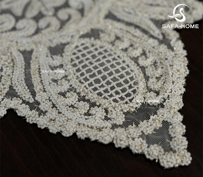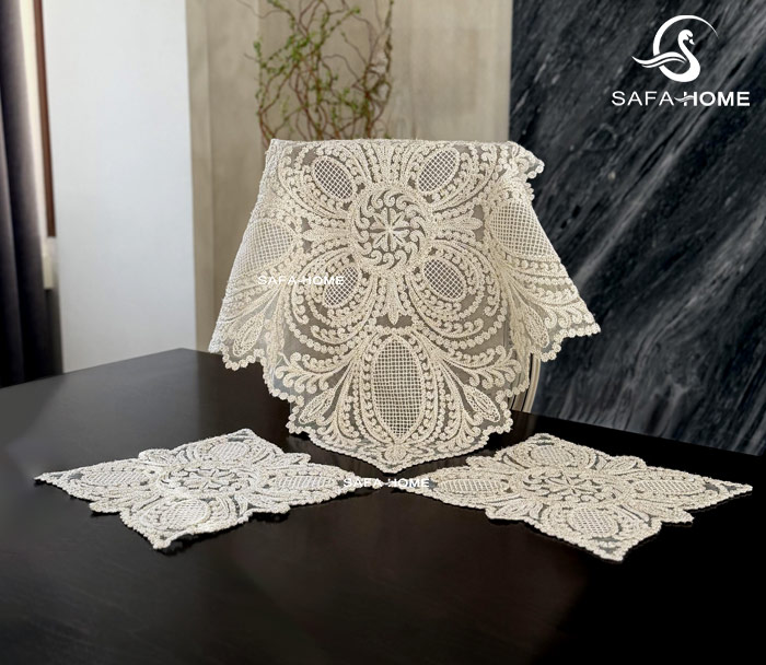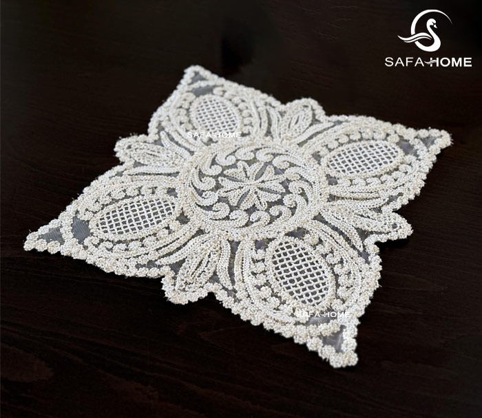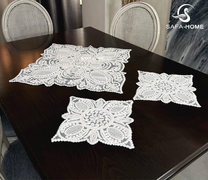 ست رومیزی جلومبلی ۳ تکه مربع مدل صدف با استفاده از قیطان های با کیفیت تولید شده است.