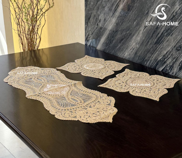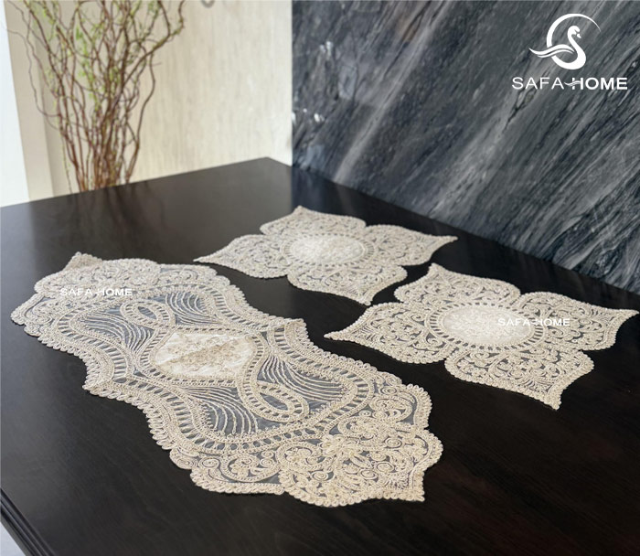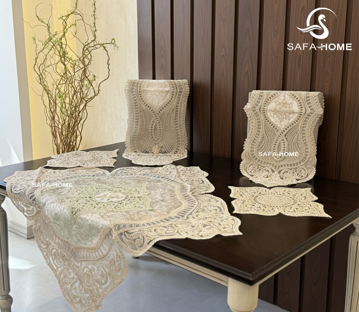 رومیزی مدرن طرح قلب 5 تکه توسط هنرمندان خوش ذوق دوخت شده است. این رومیزی از 5 تکه تشکیل شده است. به عبارتی یک رومیزی مربع بزرگ، یک رانر، یک رومیزی جلومبلی و دو عدد عسلی دارد. جنس مخمل این ست رومیزی یکی از مزایای بزرگ آن محسوب میشود. زیرا بدلیل خواب مخمل، از هر طرف که به این رومیزی نگاه کنید رنگ آن تیره و روشن می شود. به همین دلیل می توانید آن را با اکثر چیدمان های منزل، ست کنید.