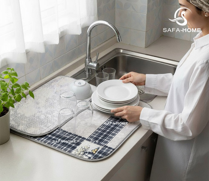 این آبگیر سینک با رویه پارچه مخمل چاپی طرح نرگس و الیاف داخلی مرغوب ساخته شده تا علاوهبر زیبایی، رطوبت ظروف را بهسرعت جذب کند.
